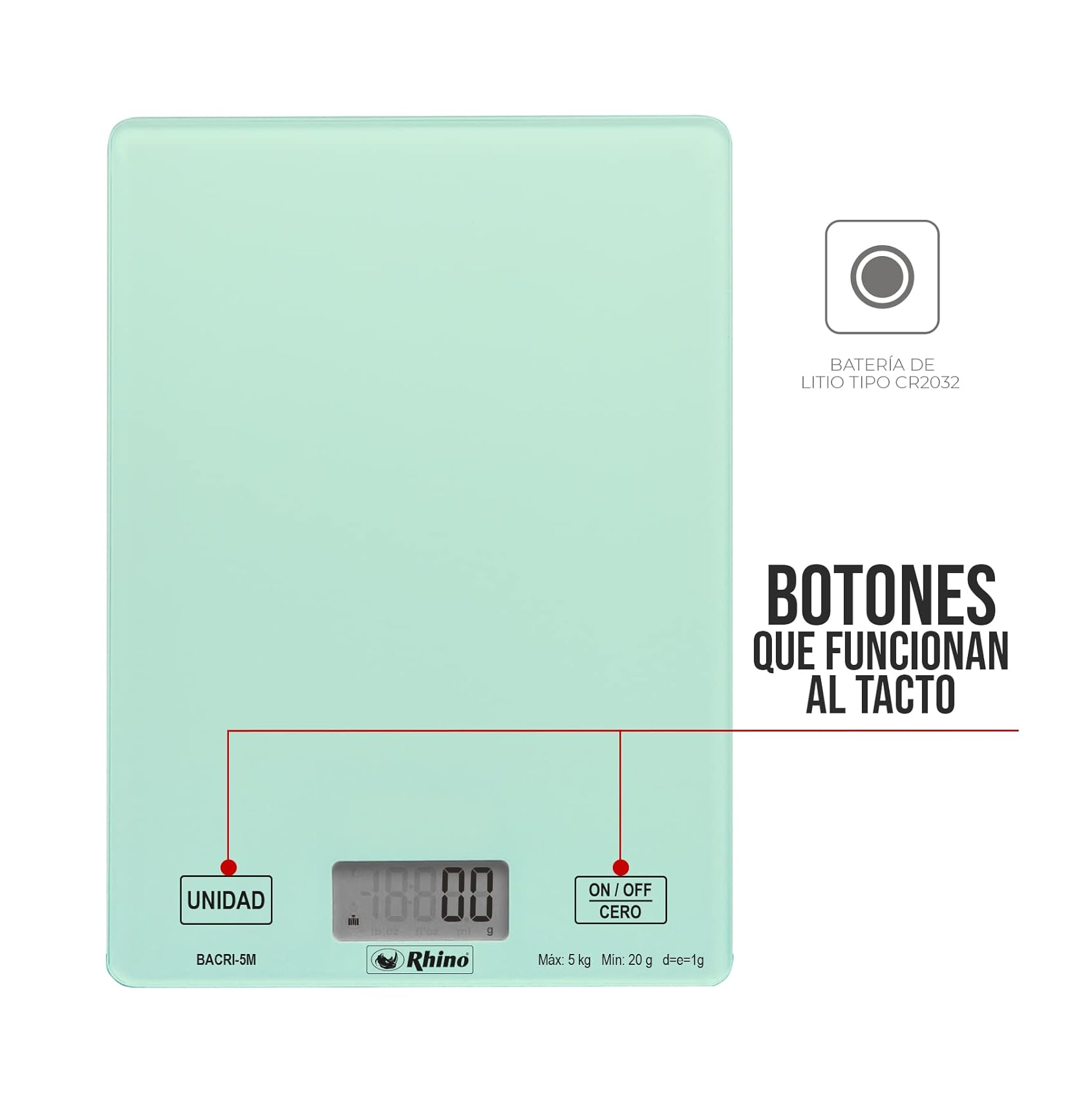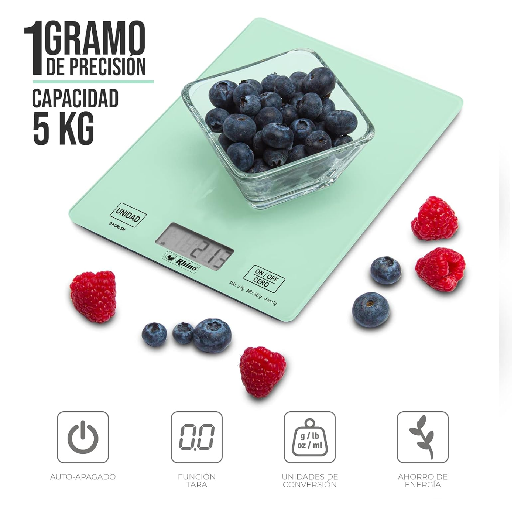 - Precisión de 1 gramo, calcula peso y volumen con plato de cristal templado