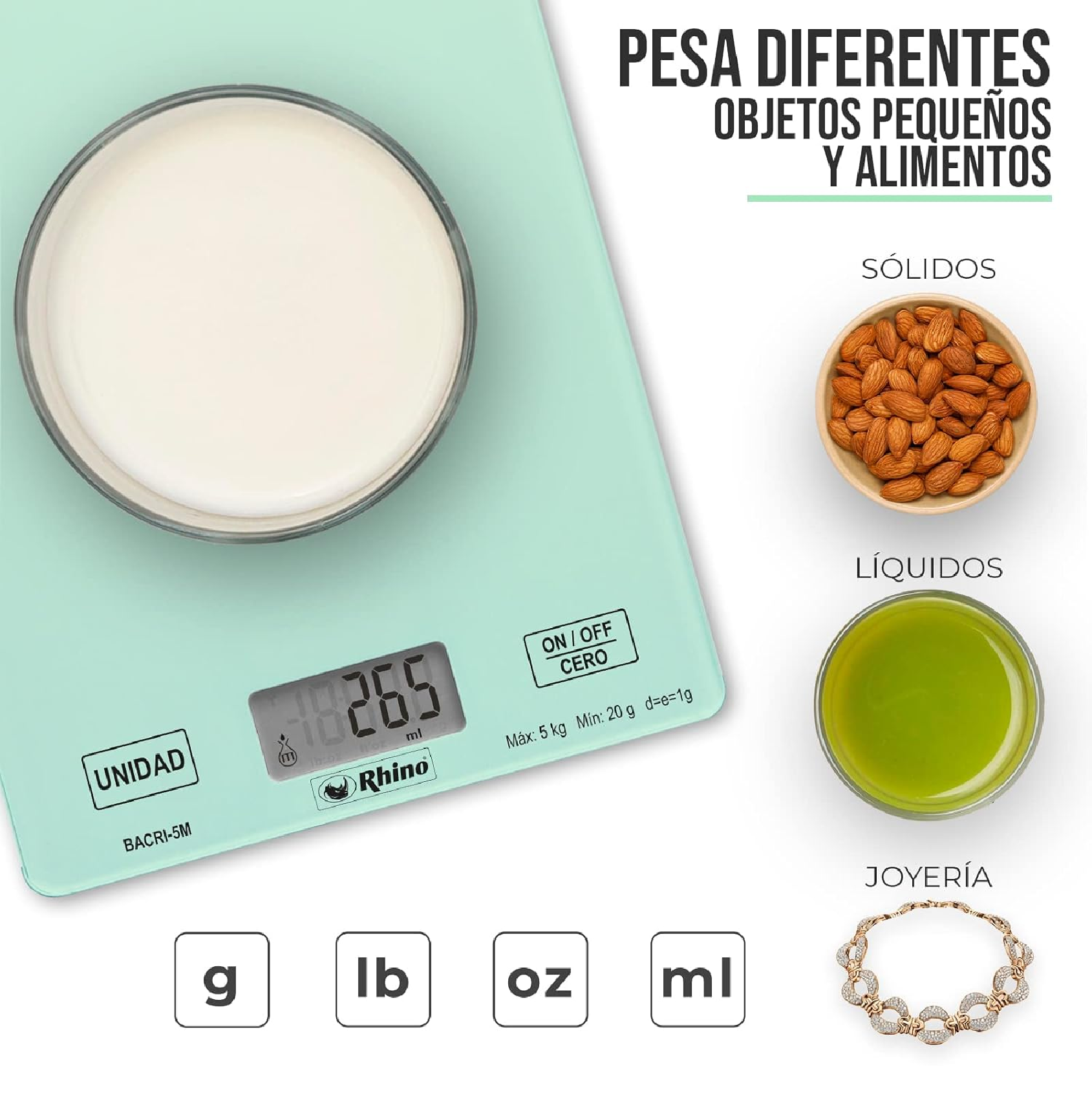 - Pesa en: gramos, libras y onzas
